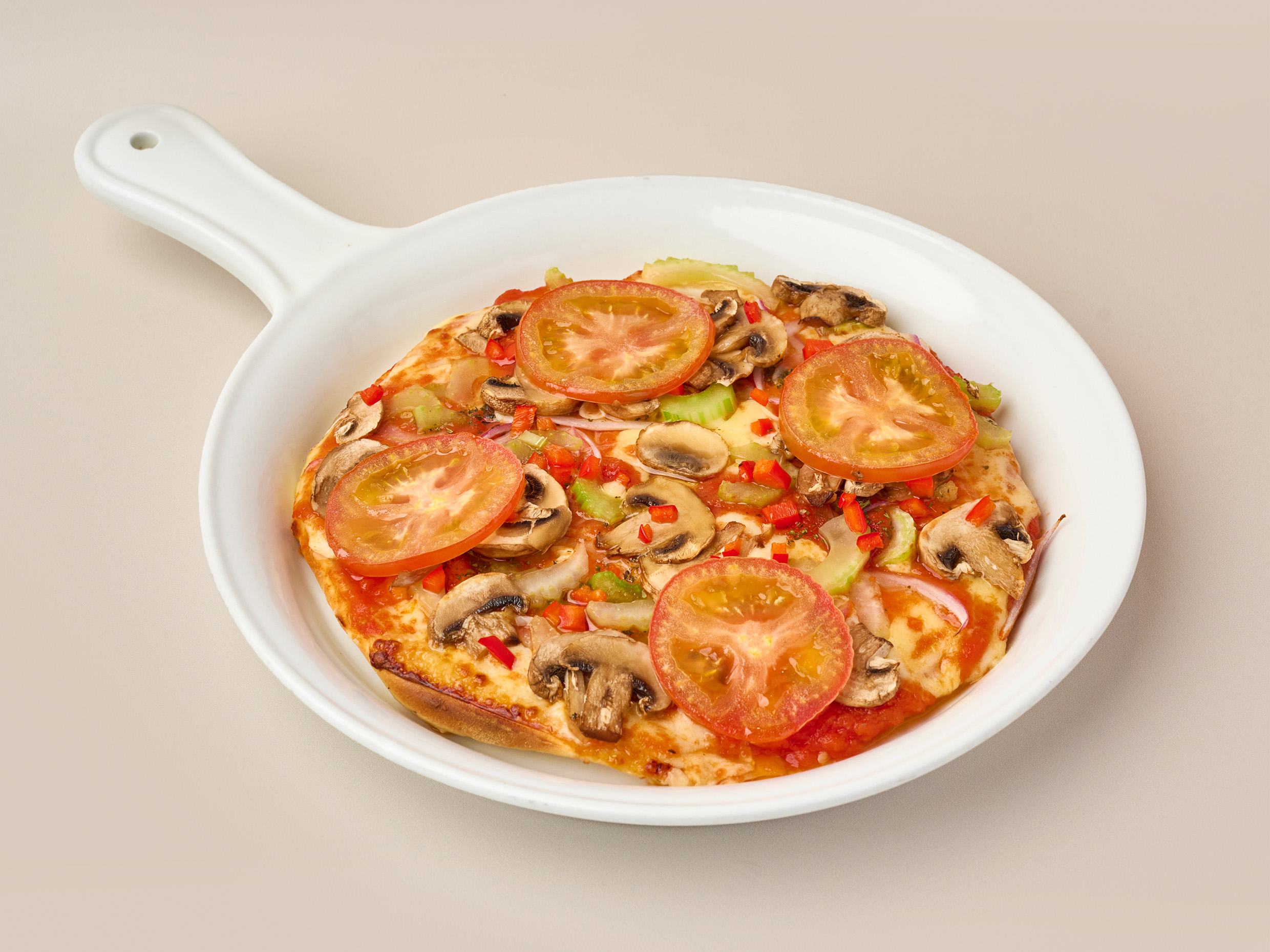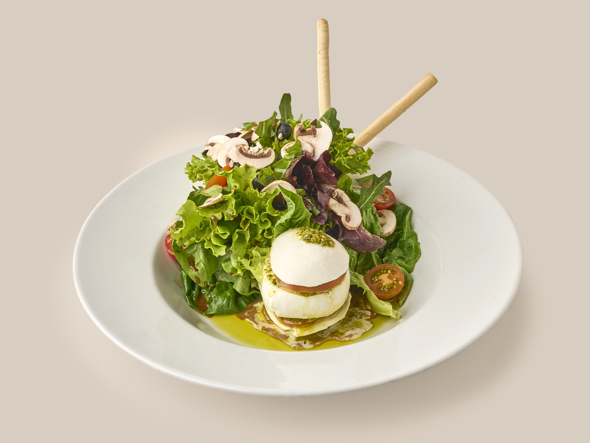 Crepe con queso mozzarella, tomate, albahaca, champiñones frescos y salsa de champiñones.
