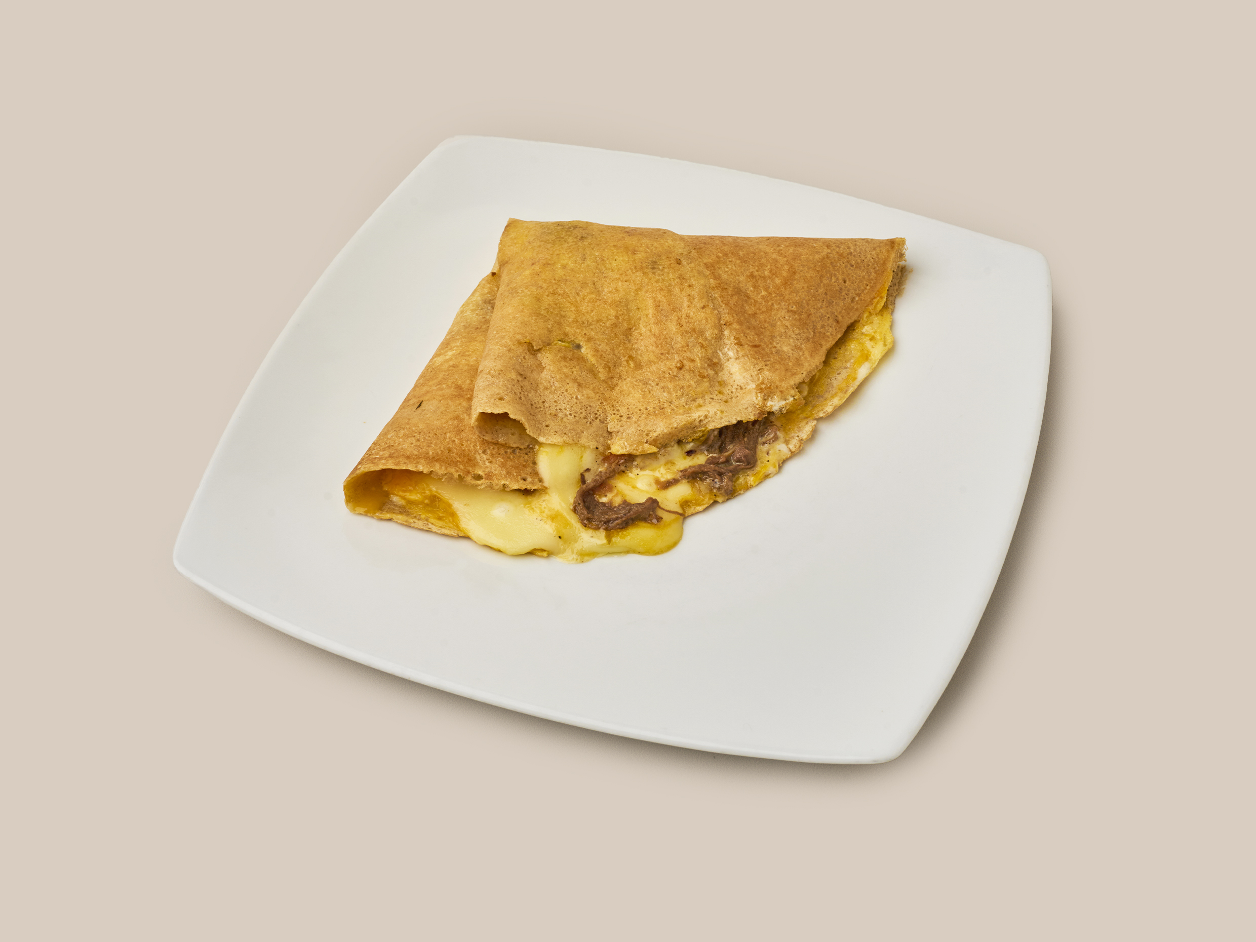 Crepe con carne desmechada, queso, huevo, crema agria y nuestro tradicional hogao.
