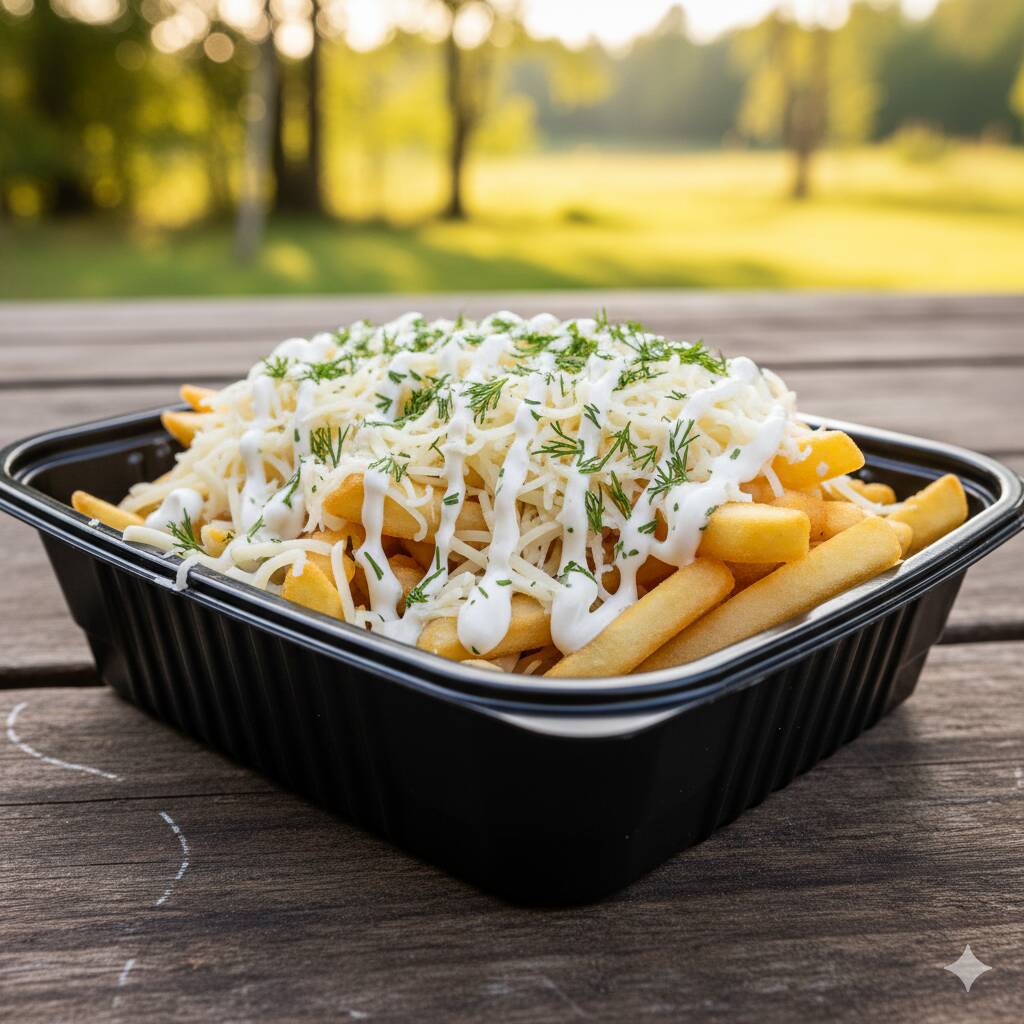 Papa francesa, chicharron carnudo crocante, chorizo ahumado, queso doble crema, tàrtara, papa fosforito