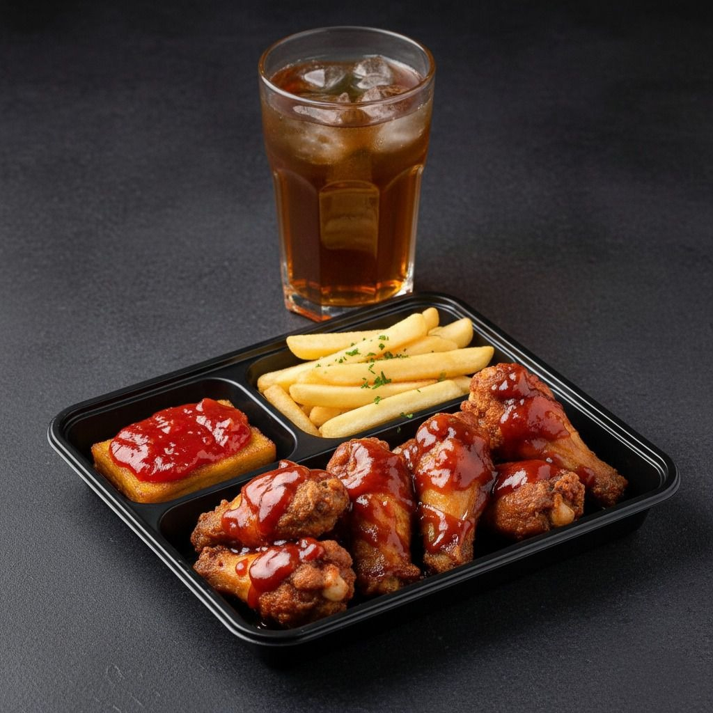 8 Alitas bañadas en salsa BBQ acompañadas de papa francesa, platano maduro con bocadillo y te obsequiamos un tè helado