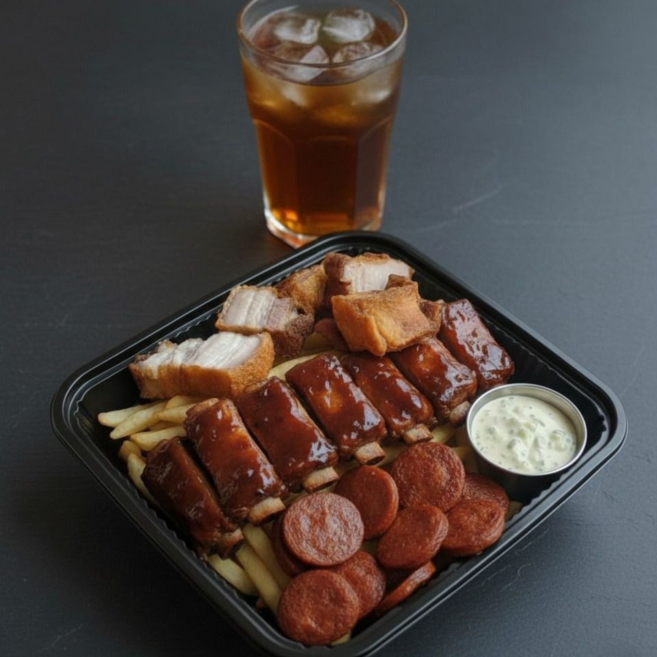 Picada personal, papa francesa, chicharron carnudo crocante, costillitas BBQ, chorizo caramelizado, acompañado de salsas. Te obsequiamos un té helado.