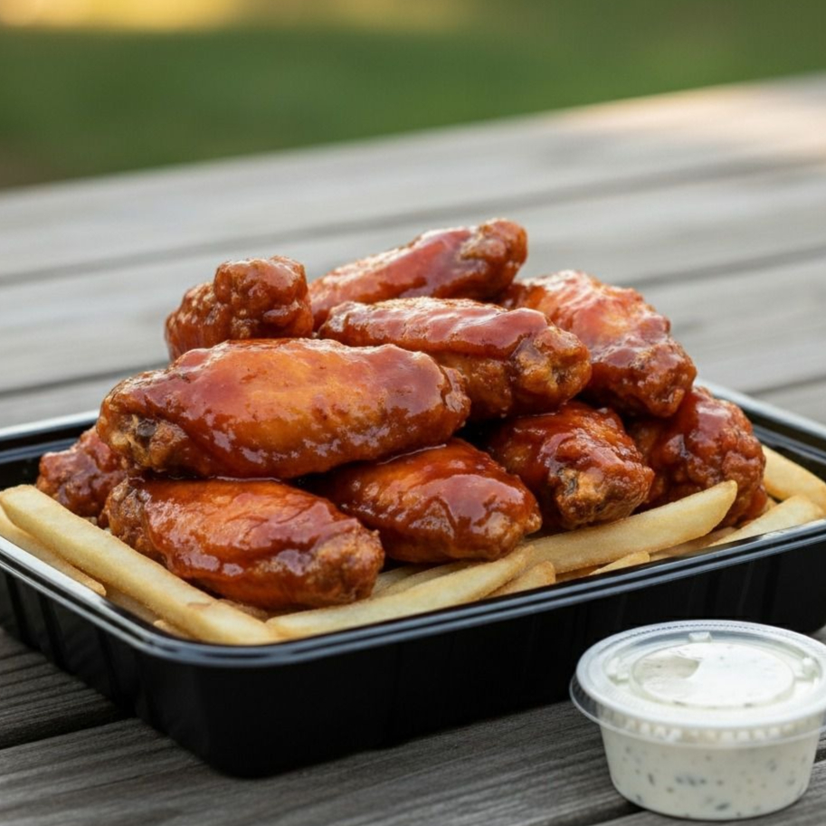 12 piezas de alitas crocantes bañadas en salsa BBQ, acompañadas de papa francesa