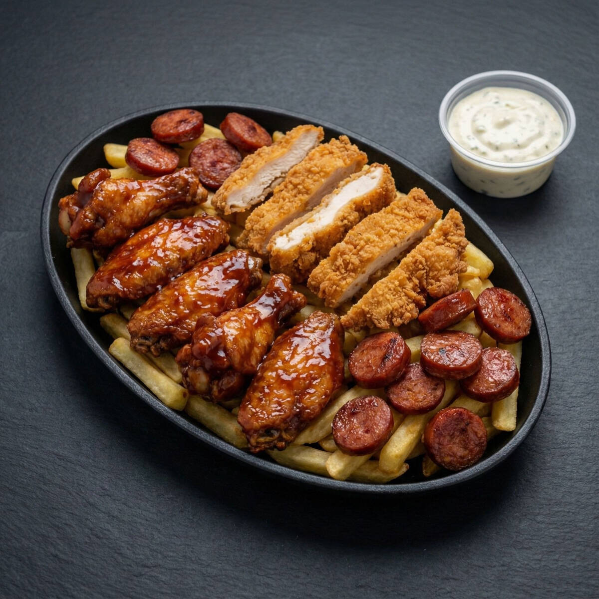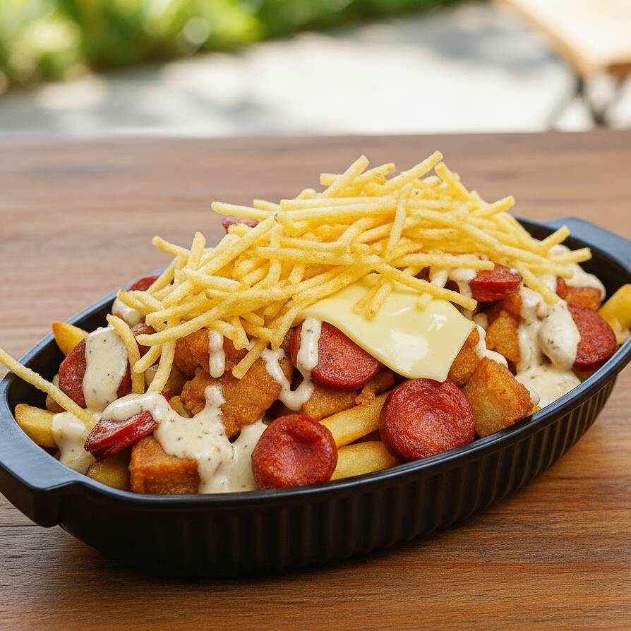 Papa crocante, bocados de pechuga a la parilla, chicharron carnudo en tiras, chorizo caramelizado, queso tajado, papa fosforito y salsas