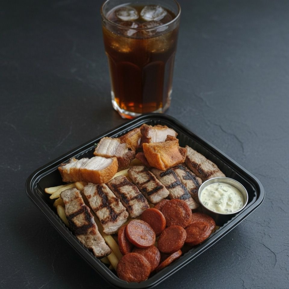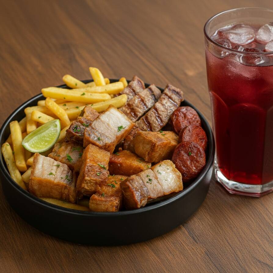 Delicioso tazon personal con chicharron carnudo premiun, chorizo de cerdo y lomito de cerdo a la parrilla, acompañado de papa fancesa y té helado.