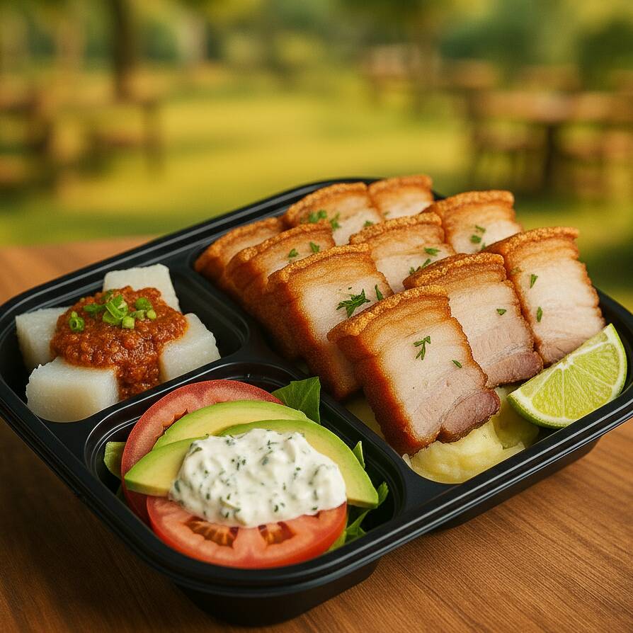 Crocante chicharron en bocados, carnudo, acompañado de yuca al vapor, limon y salsas