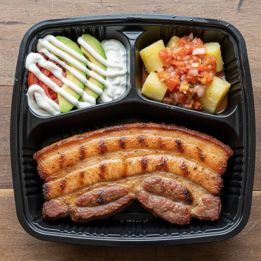 Crocante chicharron Panceta, medallones deliciosamente carnudos, acompañado de yuca al vapor y salsas