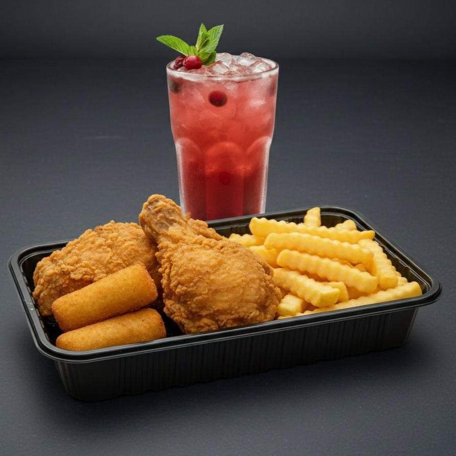 2 Deliciosas y crocante presas de pollo broaster, papa francesa, dos croquetas de yuca y té helado