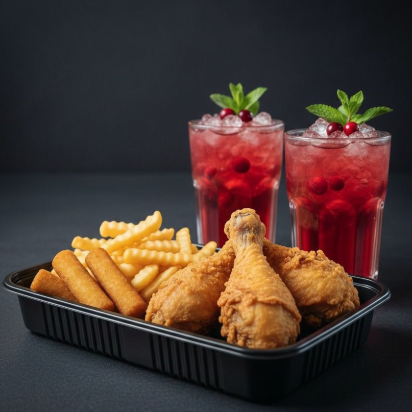 4 Deliciosas y crocante presas de pollo broaster, papa francesa, 4 croquetas de yuca y 2 té helado