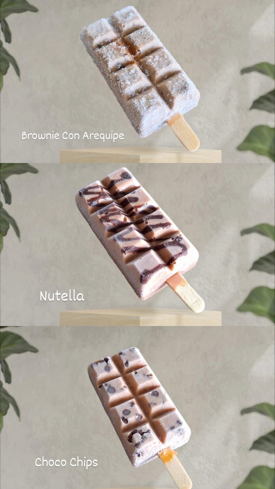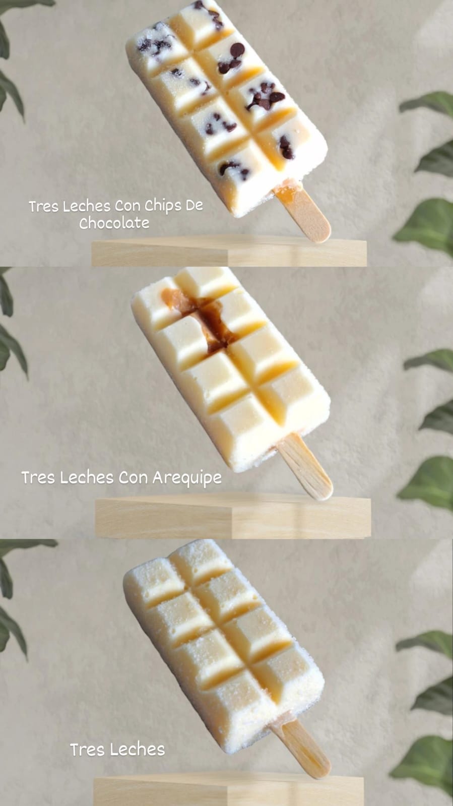 Disfruta de este combo de 3 paletas artesanales de tres leches. Incluye 1 paleta tres leches - 1 paleta tres leches con chips - 1 paleta tres leches con arequipe.