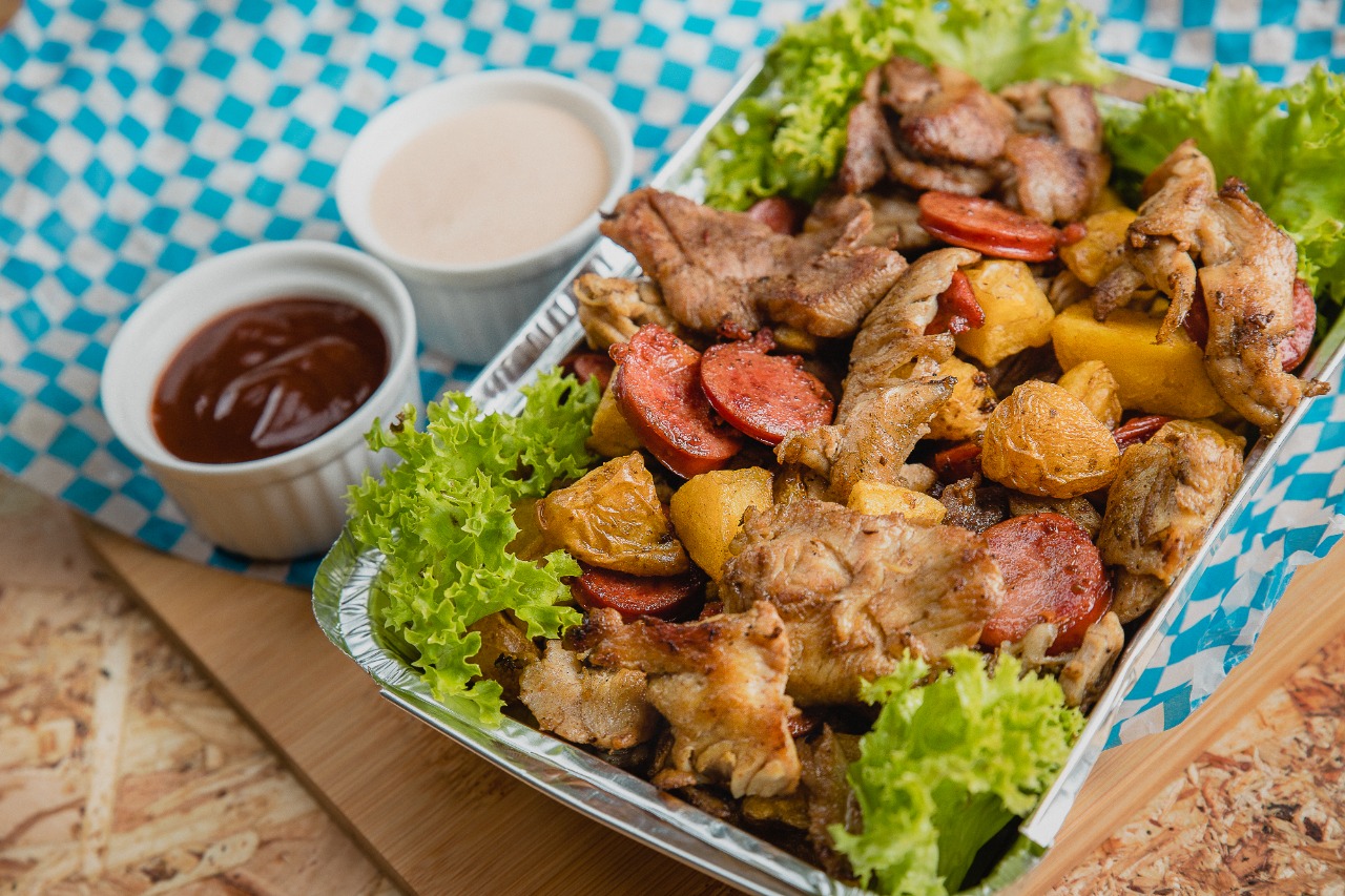 Carnes de res, cerdo, pollo y chorizo (280 gr) acompañados de papa francesa.
