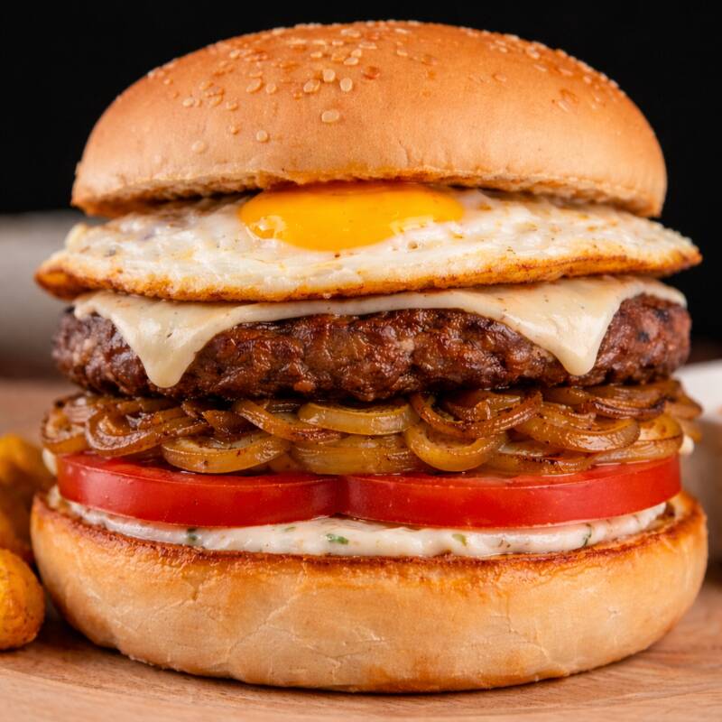 Pan, carne de res, huevo, queso, tártara, cebolla grille, tomate, acompañada de papa francesa