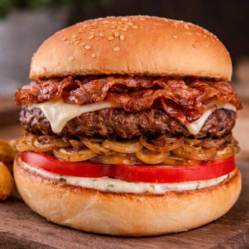 Pan, Carne res, Queso, Tocineta ahumada, Tártara, Tomate, Cebolla grille, acompañado de papa francesa