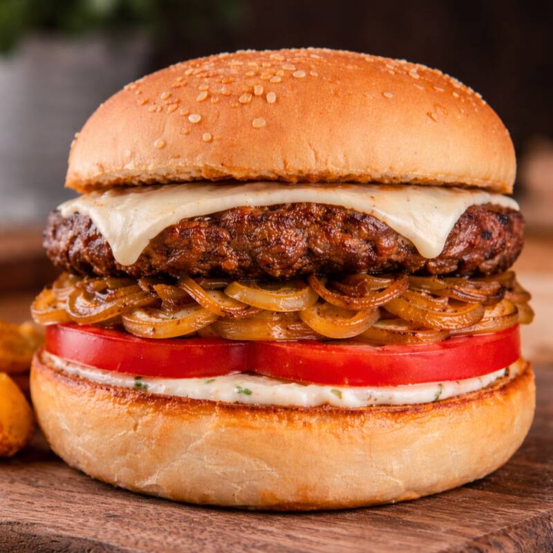Pan, carne de res, queso, tártara, cebolla grille, tomate, acompañada de papa francesa.