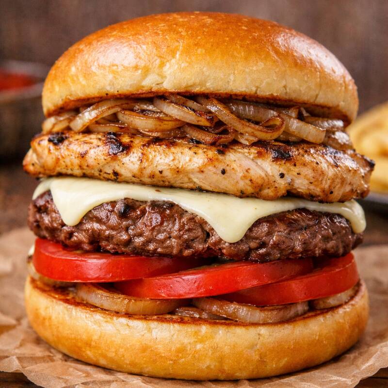 Pan, carne de res, filete de pollo, queso, tártara, cebolla grille, tomate, acompañada de papa francesa.