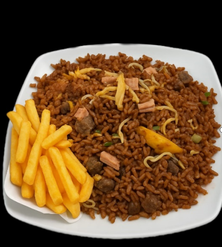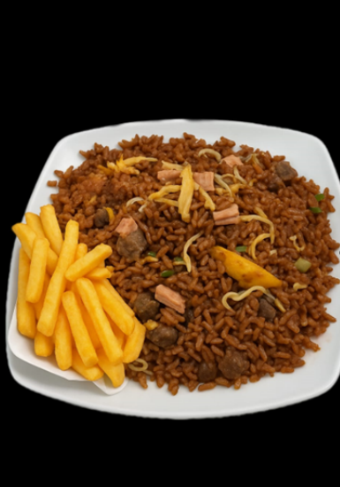 arroz con pechuga de pollo en cuadritos, carne premium en cuadritos , raices chinas, jamon premium y porción de papa a la francesa personal