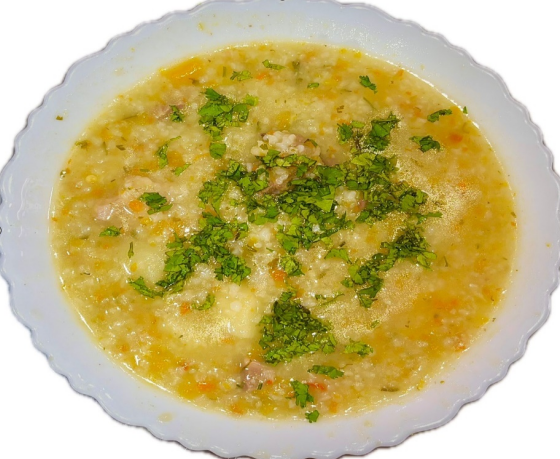 Sopa del día, generalmente de arroz con menudencias.