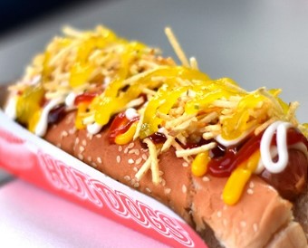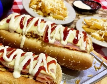 Perro con chorizo, jamón, pollo desmechado, queso, maíz, papa ripeada, cebolla grillé y papa francesa con queso.