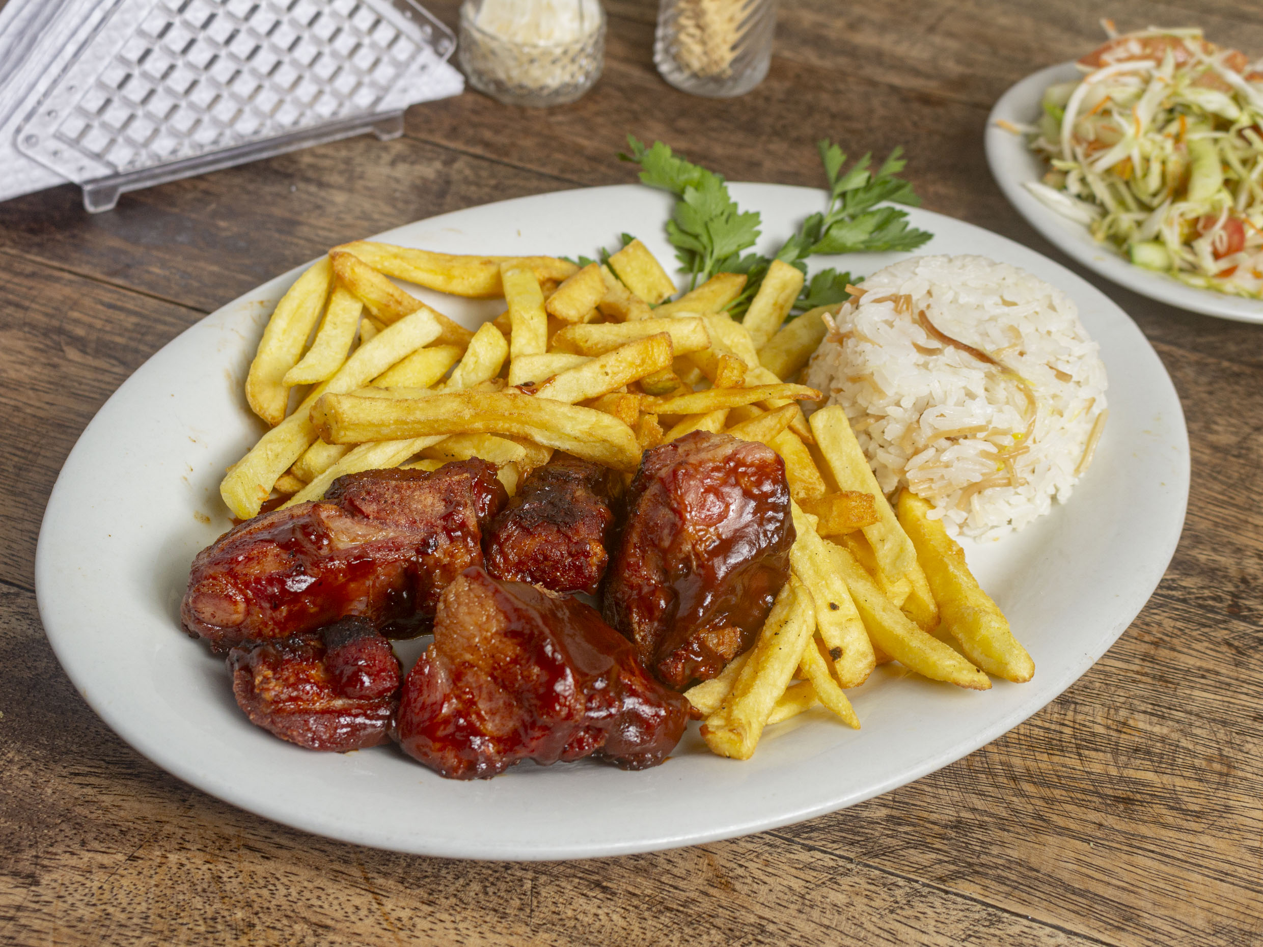 Costilla de Cerdo 450 gr con salsa BBQ y papa a la francesa