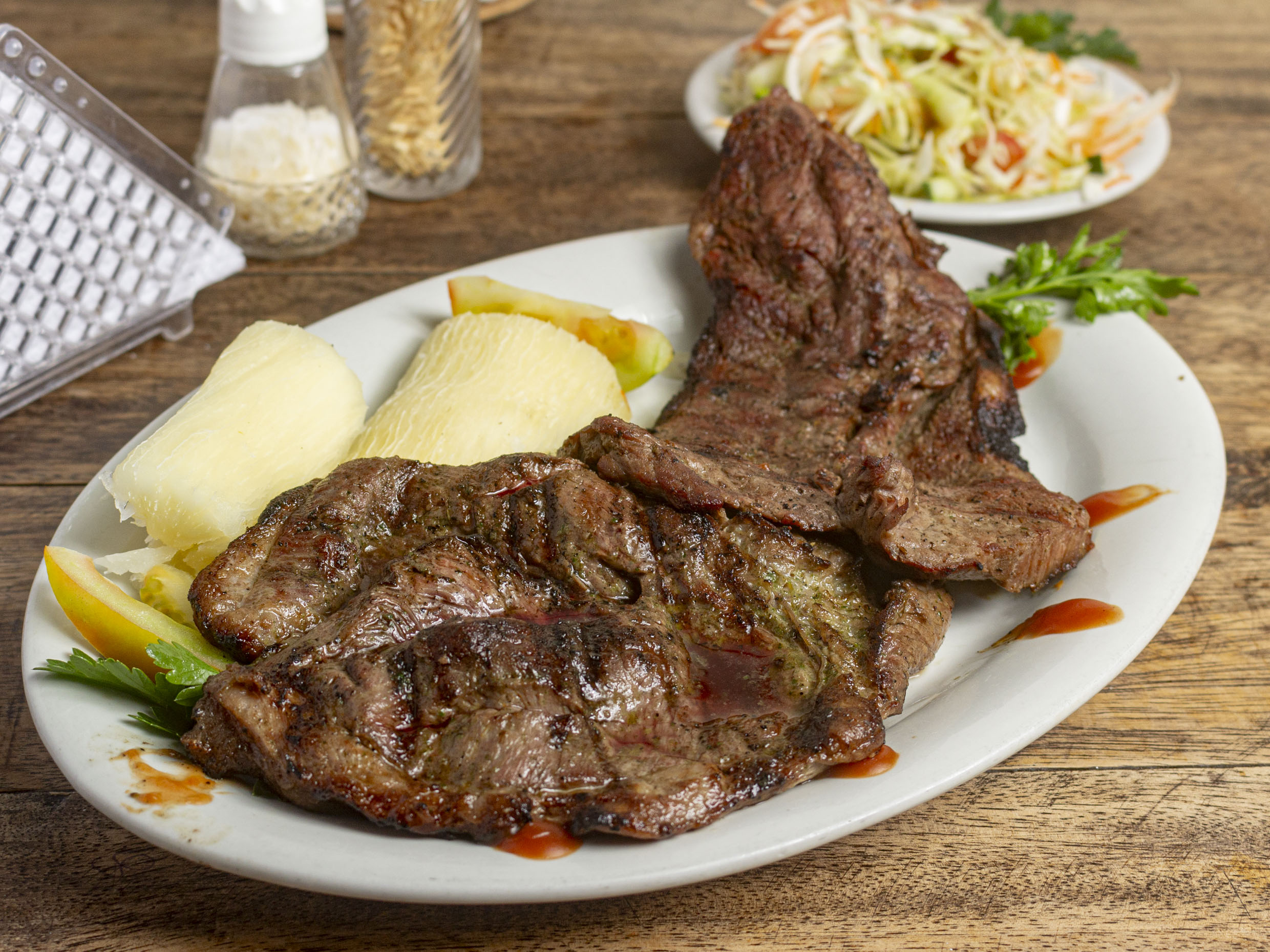 carne asada 350 gr con yuca , papa al vapor y ensalada