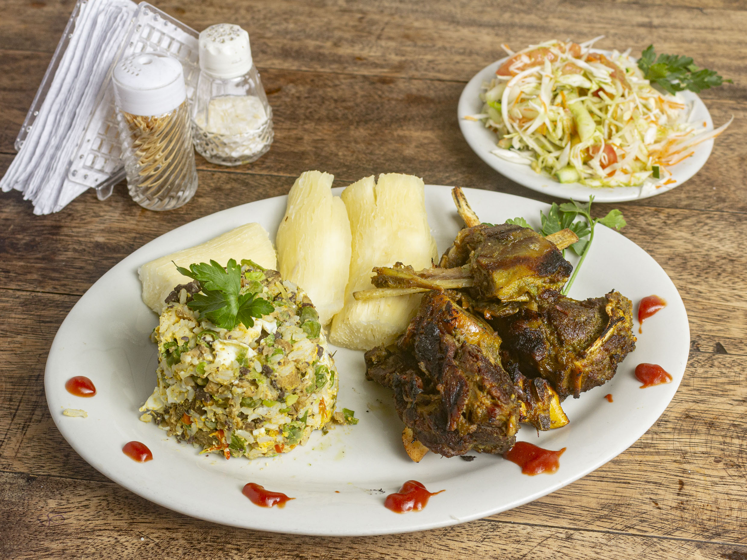 500 gr cabro, acompañado con pepitoria, papa al vapor, yuca, y ensalada con aguacate.
