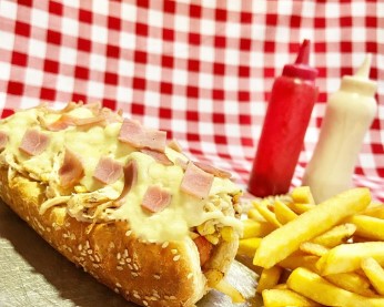 Perro con salchicha americana, carne y pechuga en cubitos, maíz, jamón, queso, papa ripeada, cebolla grillé y papa francesa con queso.