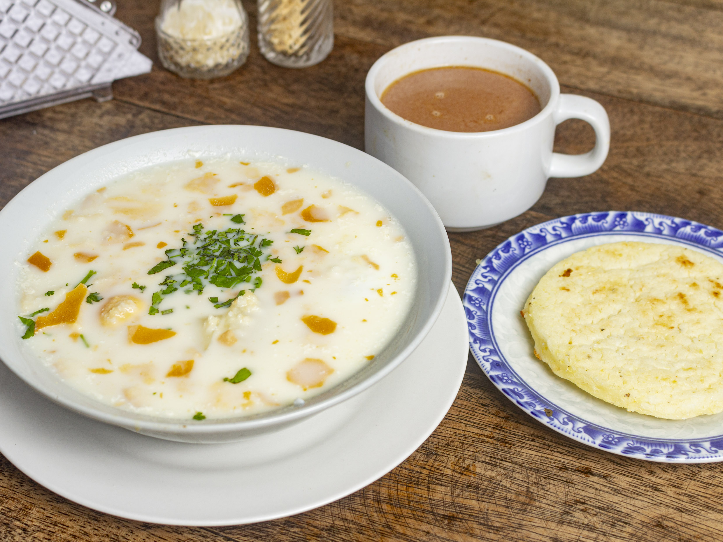 Caldo de costilla o de carne, acompañado de arepa amarilla o blanca, café o chocolate.