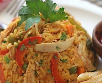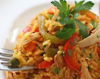 Arroz con carne , pollo, cerdo, chorizo, maduro, arveja y papas a la francesa