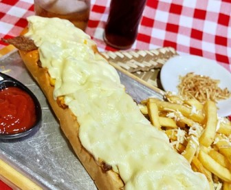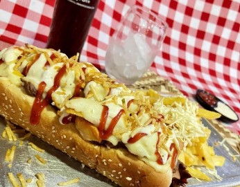 Perro con salchicha americana, jamón, queso, papa ripeada, cebolla grillé y papa a la francesa con queso rallado.