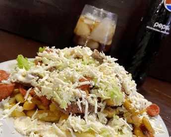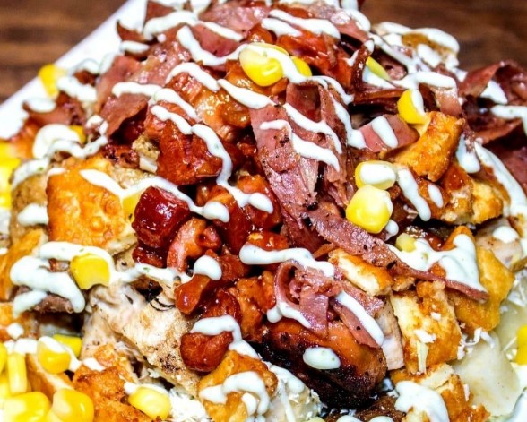 Papas a la francesa con maíz, carne, pechuga, chorizo, cebolla grillé y queso.