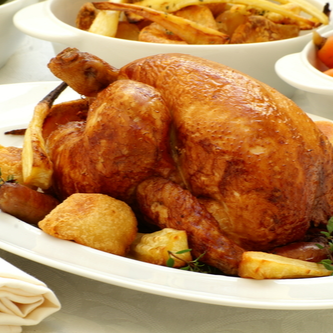 Pollo asado , papa al vapor, yuca, plátano maduro y una sopa.