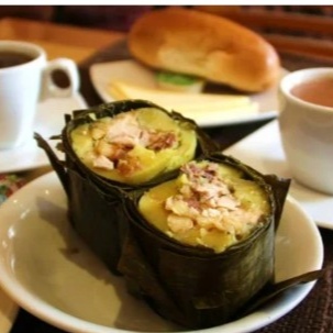Tamal Santandereano, Acompañado de pan, chocolate o café y queso.