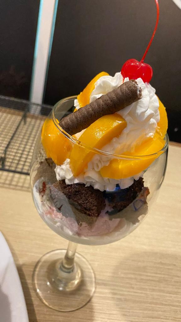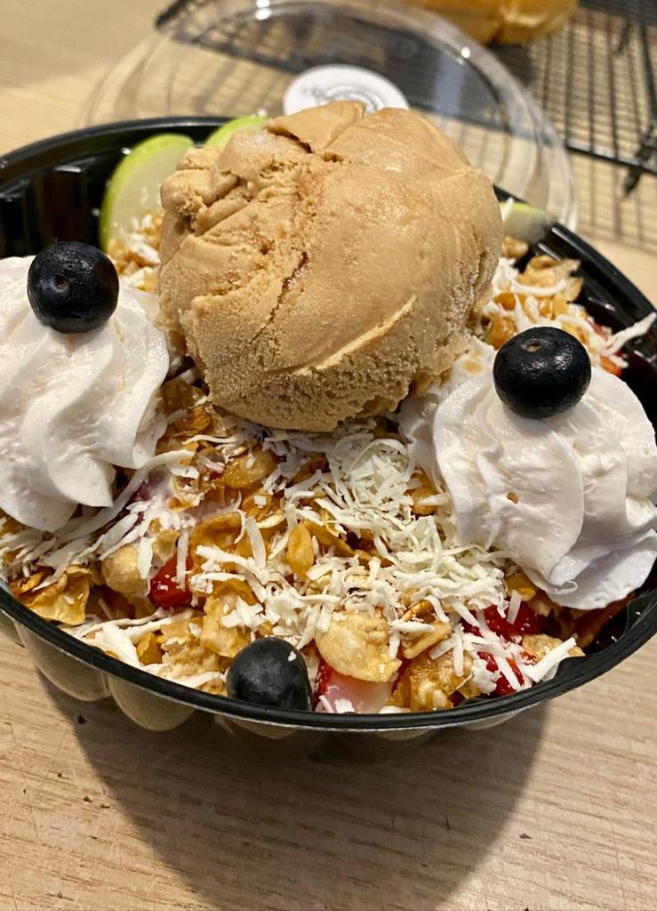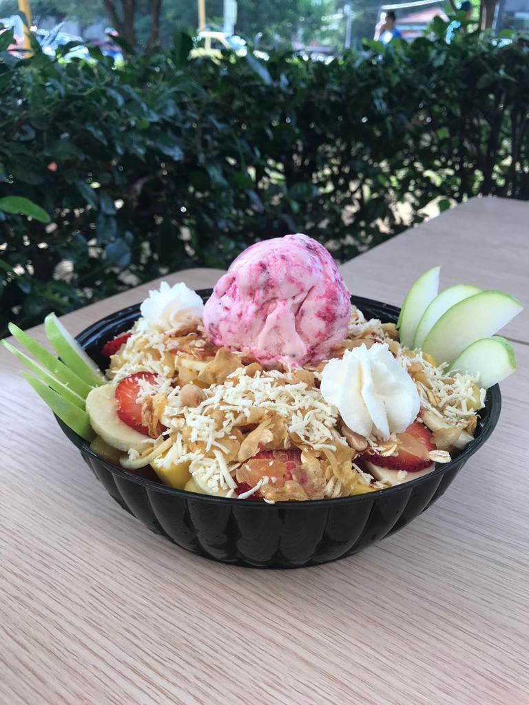 Frutas de temporada, crema inglesa, granola, queso, crema chantilly y una porción de helado de tu elección.