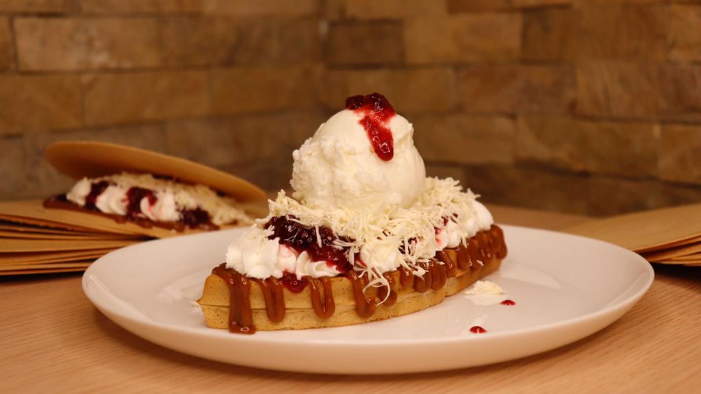 Waffle de vainilla mediano, arequipe, crema chantilly, queso, salsa de mora artesanal.
