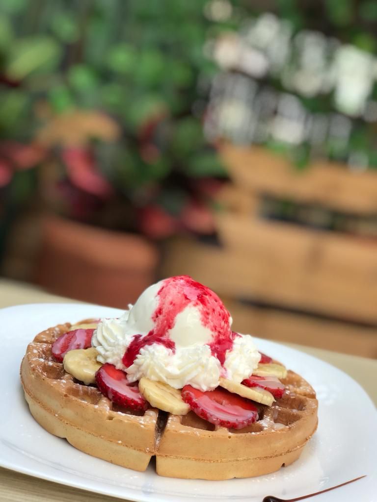 Waffle grande de vainilla, fresa, banano, chantilly, helado de vainilla, salsa de fresa artesanal.