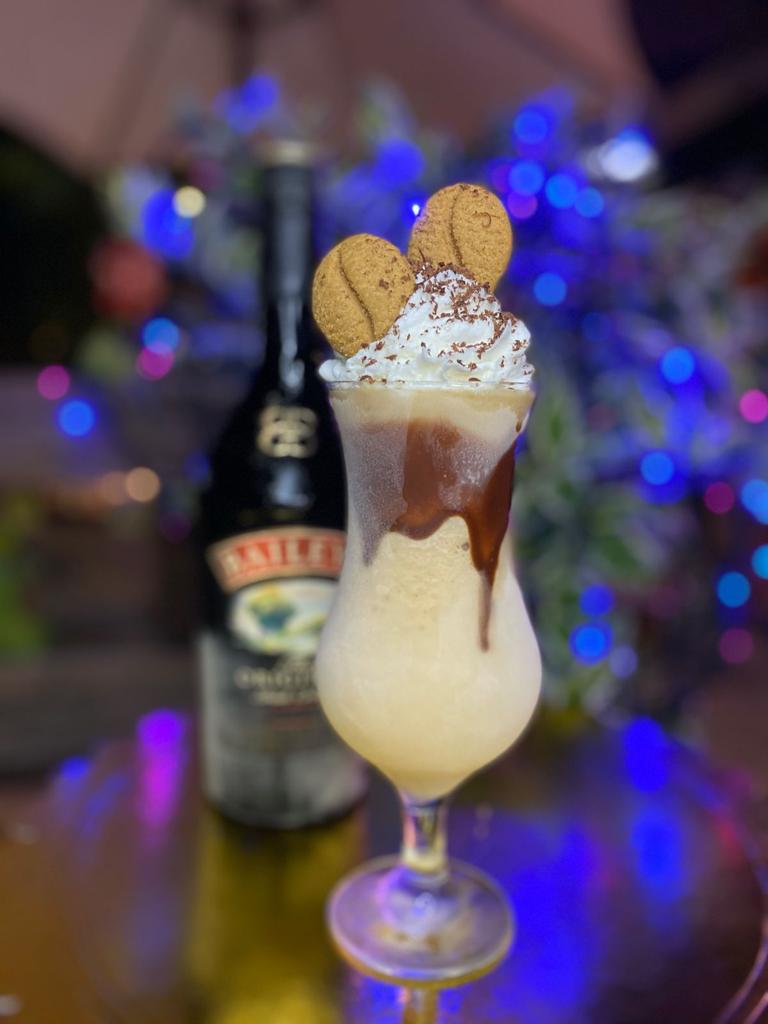 Nevado de café con licor de baileys, crema chantilly, acompañado de galletas de café y lascas de chocolate.