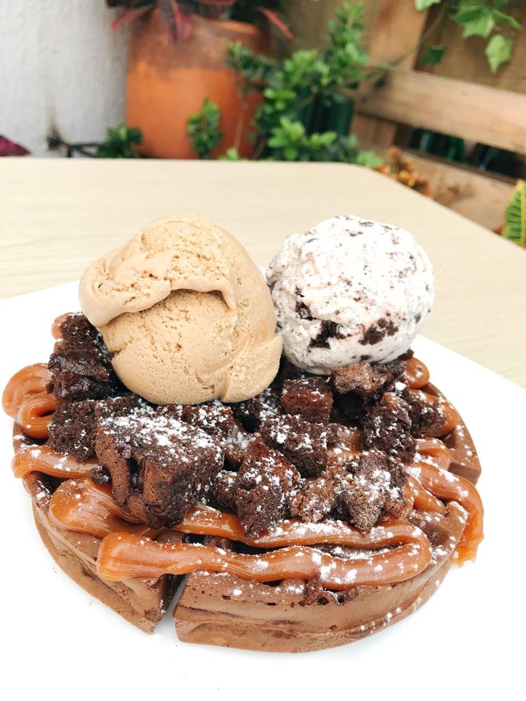 Waffle de chocolate grande, arequipe, trozos de brownie caliente, helado de arequipe y Oreo.