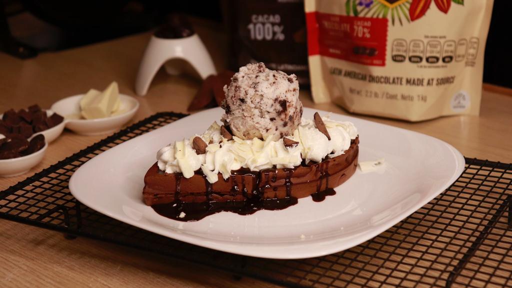 waffle mediano de chocolate con ganashe de chocolate oscuro, helado de brownie, chantillí y escamas de chocolate al 70 % y blanco