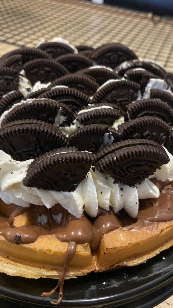 Waffle de vainilla, nutella, crema chantilly y trozos de galleta Oreo, helado del sabor de tu preferencia.
