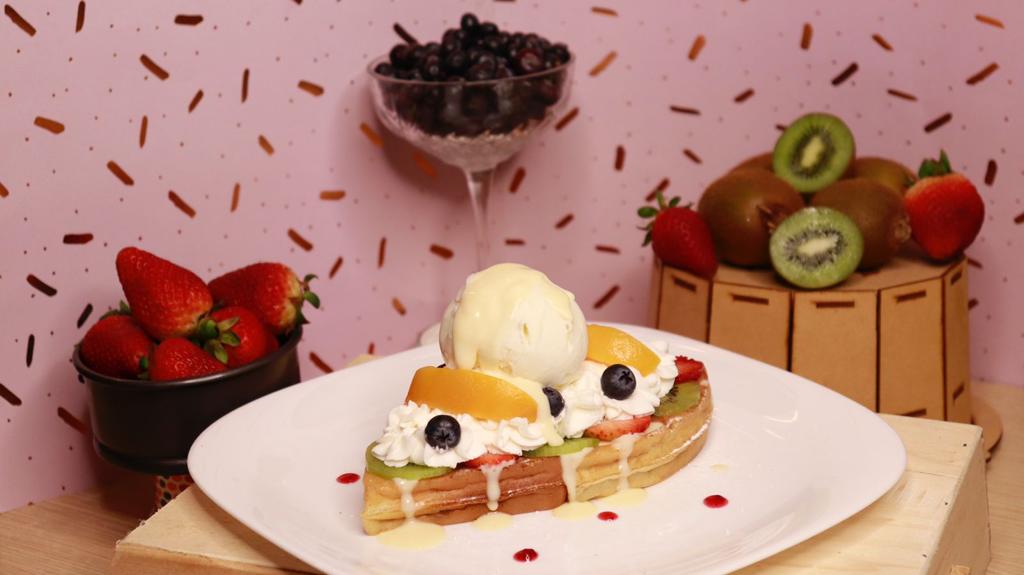 waffle de vainilla mediano, crema inglesa, kiwi, fresa, durazno, arándanos, chantillí y helado de vainilla