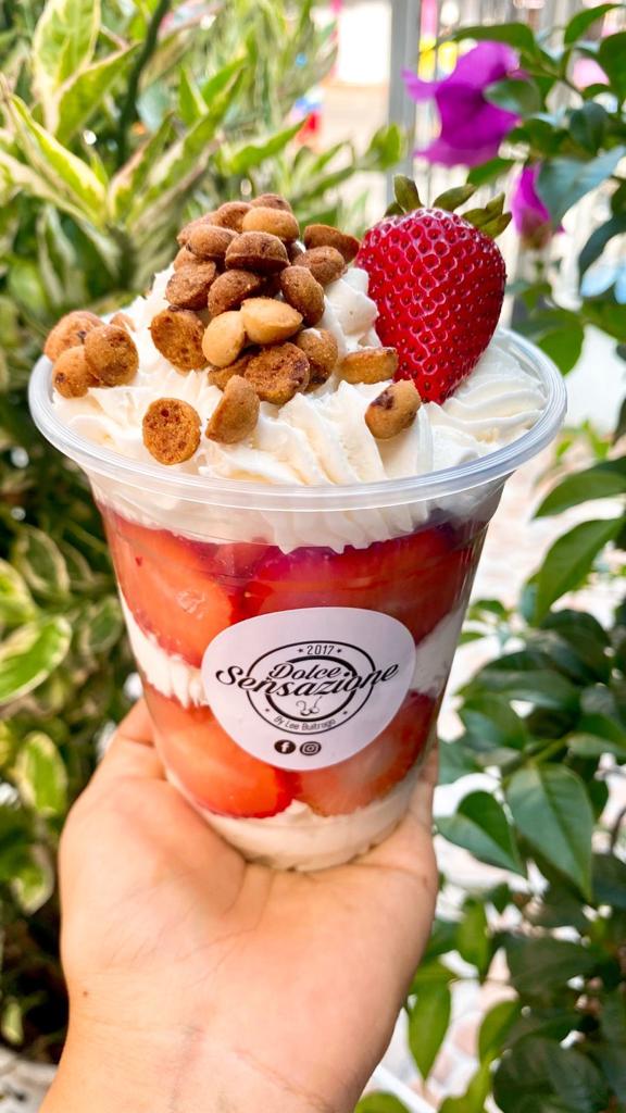 fresas seleccionadas, crema chantillí, crema inglesa y crumble de galletas