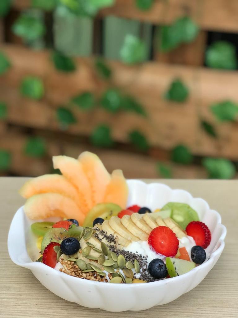 Cortes de fruta fresca con yogurt griego, arándanos, semillas chía, semillas de girasol, almendras y blue agave orgánico.