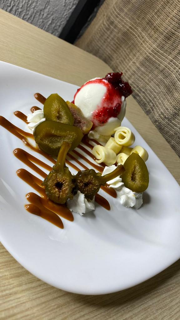 Brevas almibaradas en panela y especias, con helado de vainilla, crema chantilly, arequipe, queso doble crema y salsa de mora.