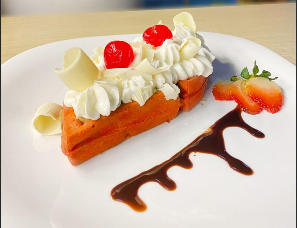 Waffle red velvet mediano, salsa de queso crema, crema chantilly, cerezas y escamas de chocolate blanco, acompañado de tu sabor de helado favorito.