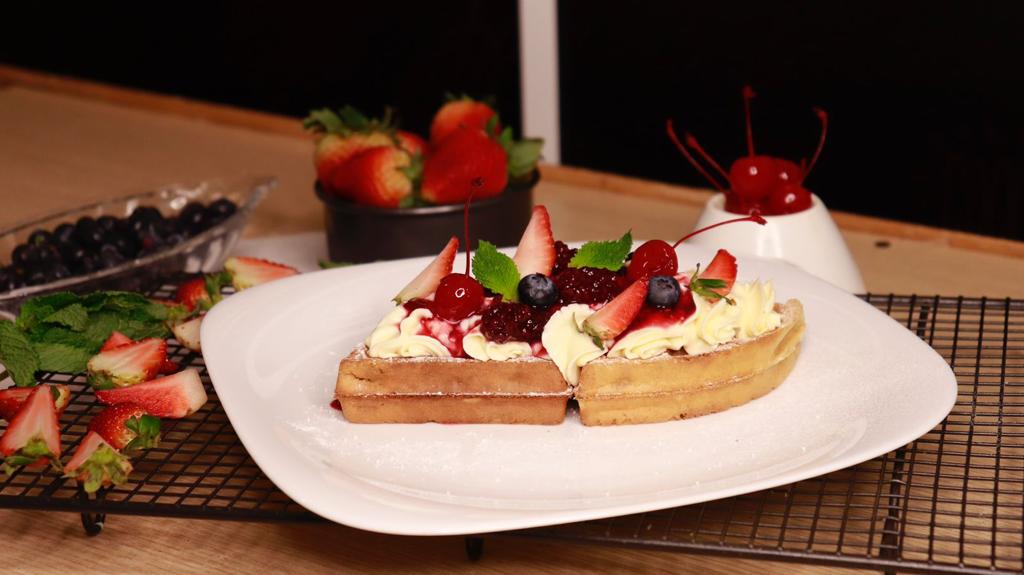 waffle de vainilla mediano, crema inglesa, chantillí de queso crema, fresas, arándanos, cerezas y mermelada artesanal de mora