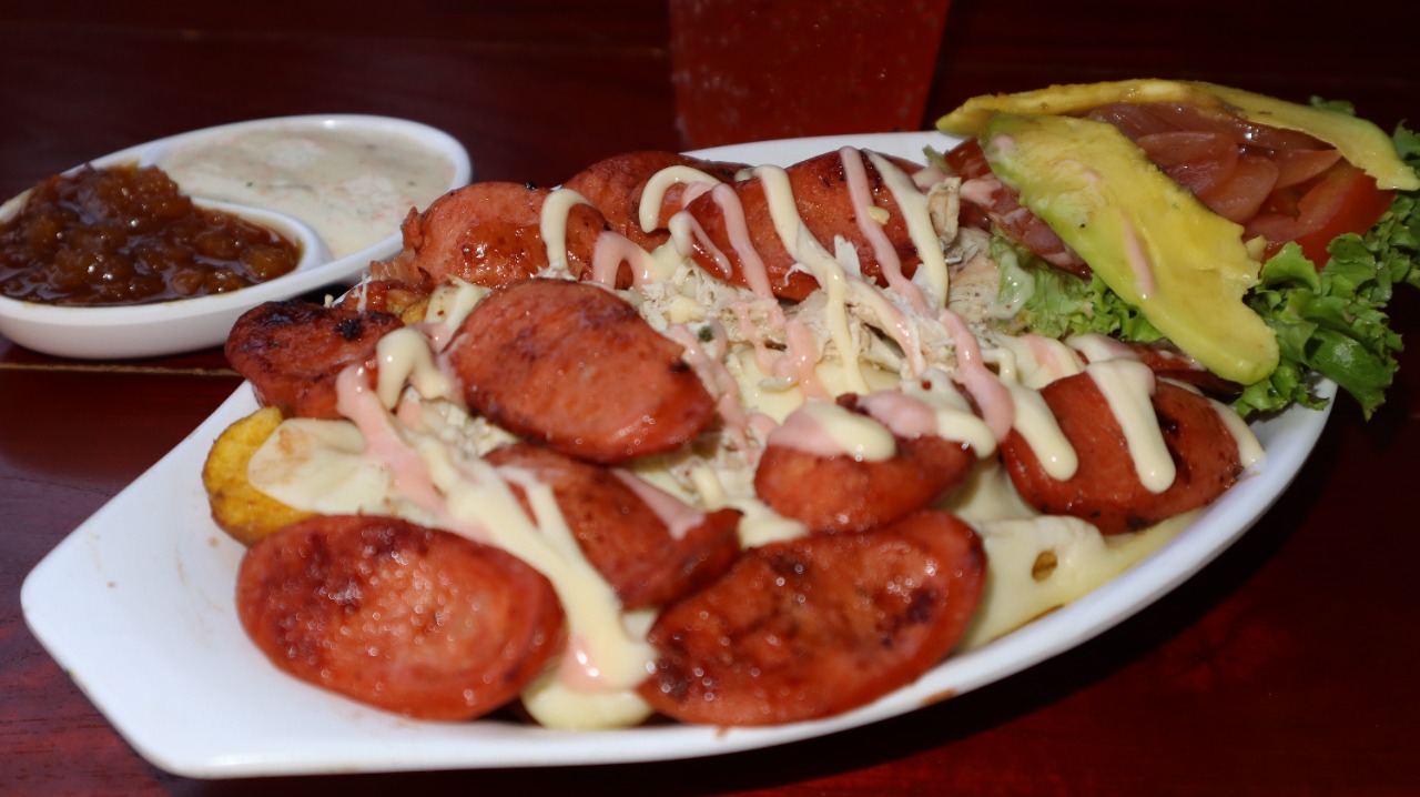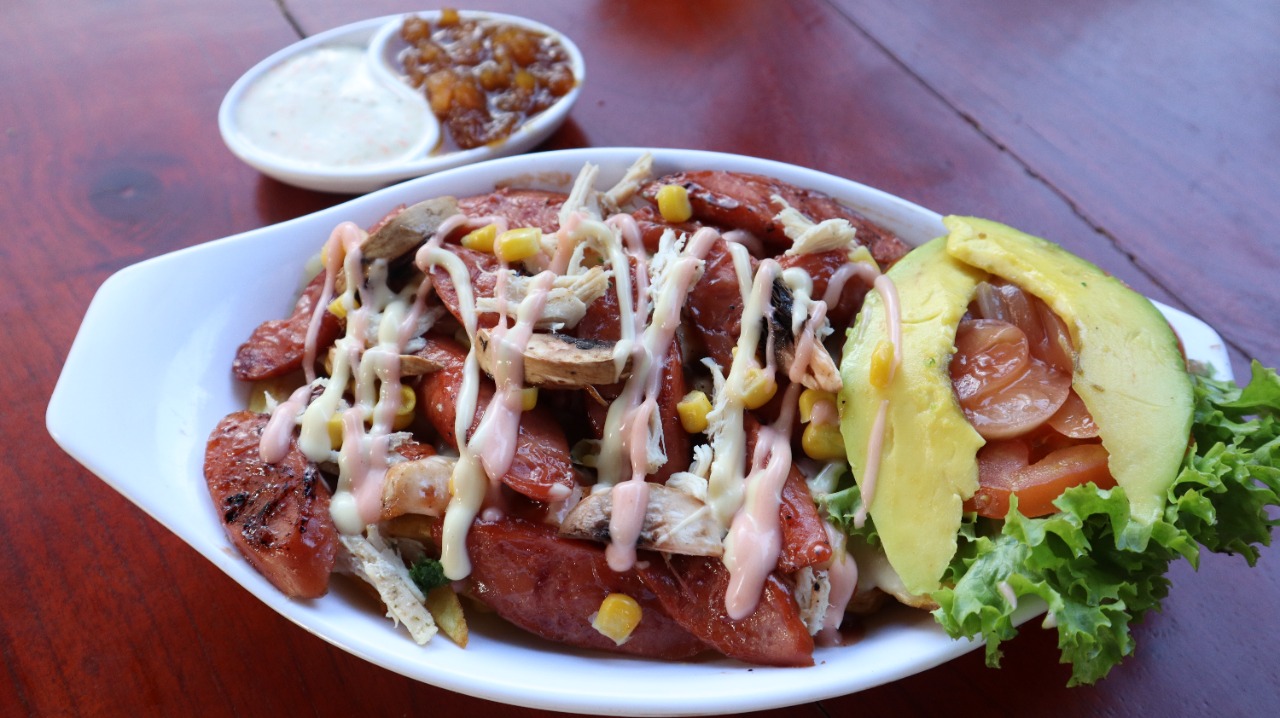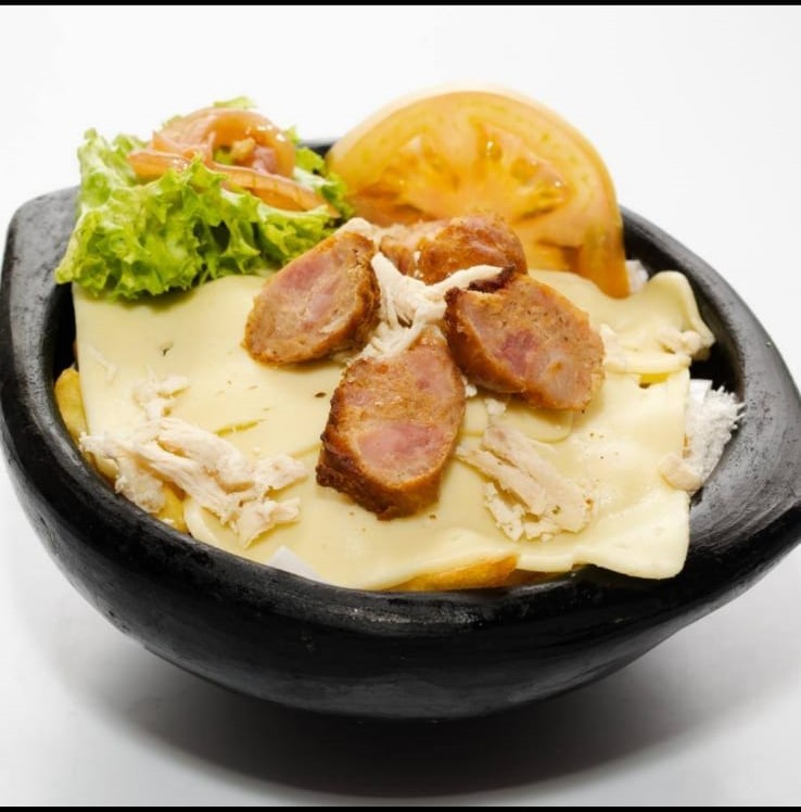 Chorizo paisa, pollo desmechado bañado en salsa de la casa, crema de queso cheddar, carne desmechada, maíz tierno, queso doble crema, tocineta, papa chip, cebolla grillé, cuadros de piña y salsa de la casa, acompañado de papa a la francesa o papa amarilla.