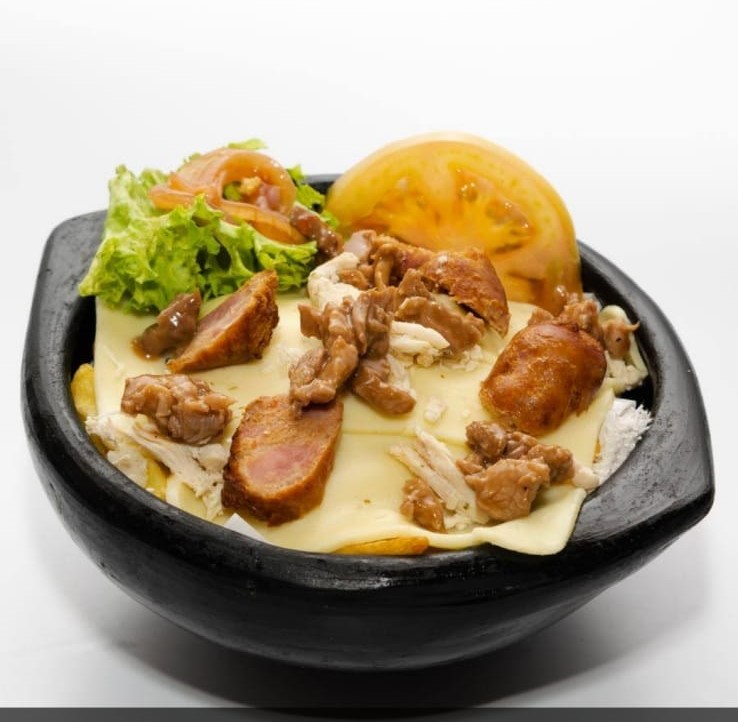 Carne, salchicha ranchera, tocineta, queso cheddar, aros de cebolla, arepa, cuadritos de cerdo en salsa BBQ, queso doble crema, papa chip, cuadros de piña, tomate, lechuga y salsa de la casa, acompañada de papa a la francesa o papa amarilla.