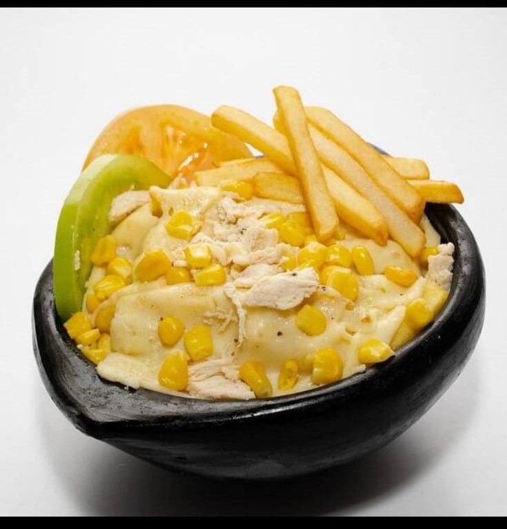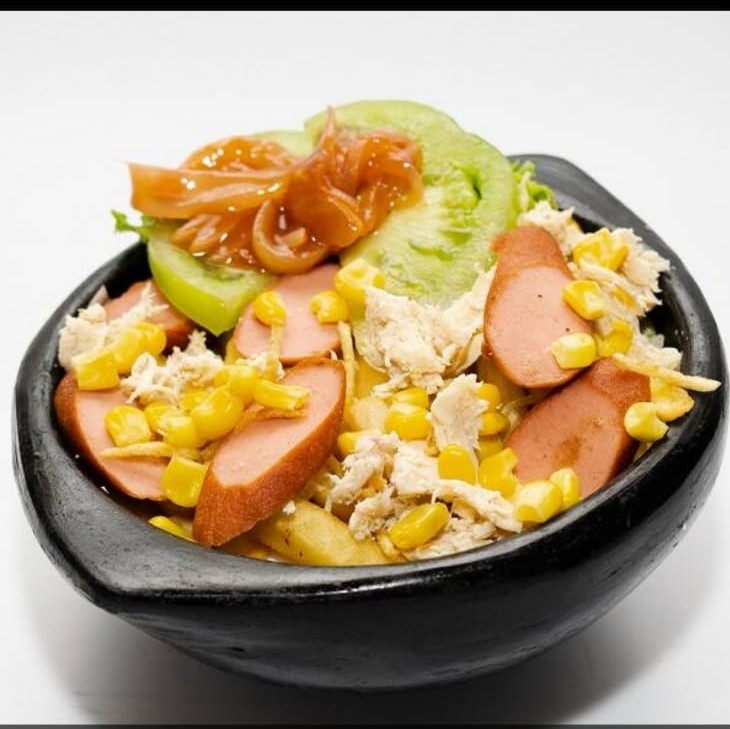 200 g De maíz tierno, chorizo paisa, tocineta, carne desmechada, salchicha Ranchera, pollo desmechado, papa chip, queso semi salado, queso doble crema y salsa de la casa, acompañado con papa a la francesa.