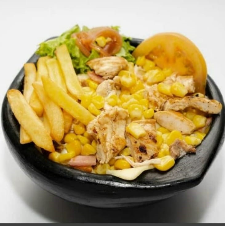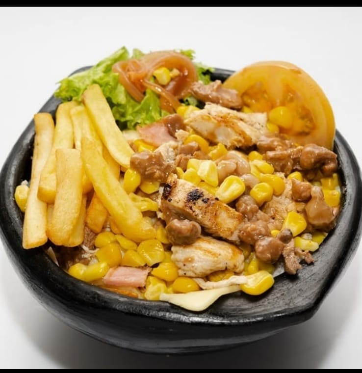 200 g De maíz tierno, pollo desmechado con champiñón bañado en salsa de la casa, cuadros de lomo de cerdo bañados en salsa BBQ, tocineta, papa chip, queso semi salado, queso doble crema, cebolla grillé, tomate, lechuga y salsa de la casa, acompañado con papa a la francesa.