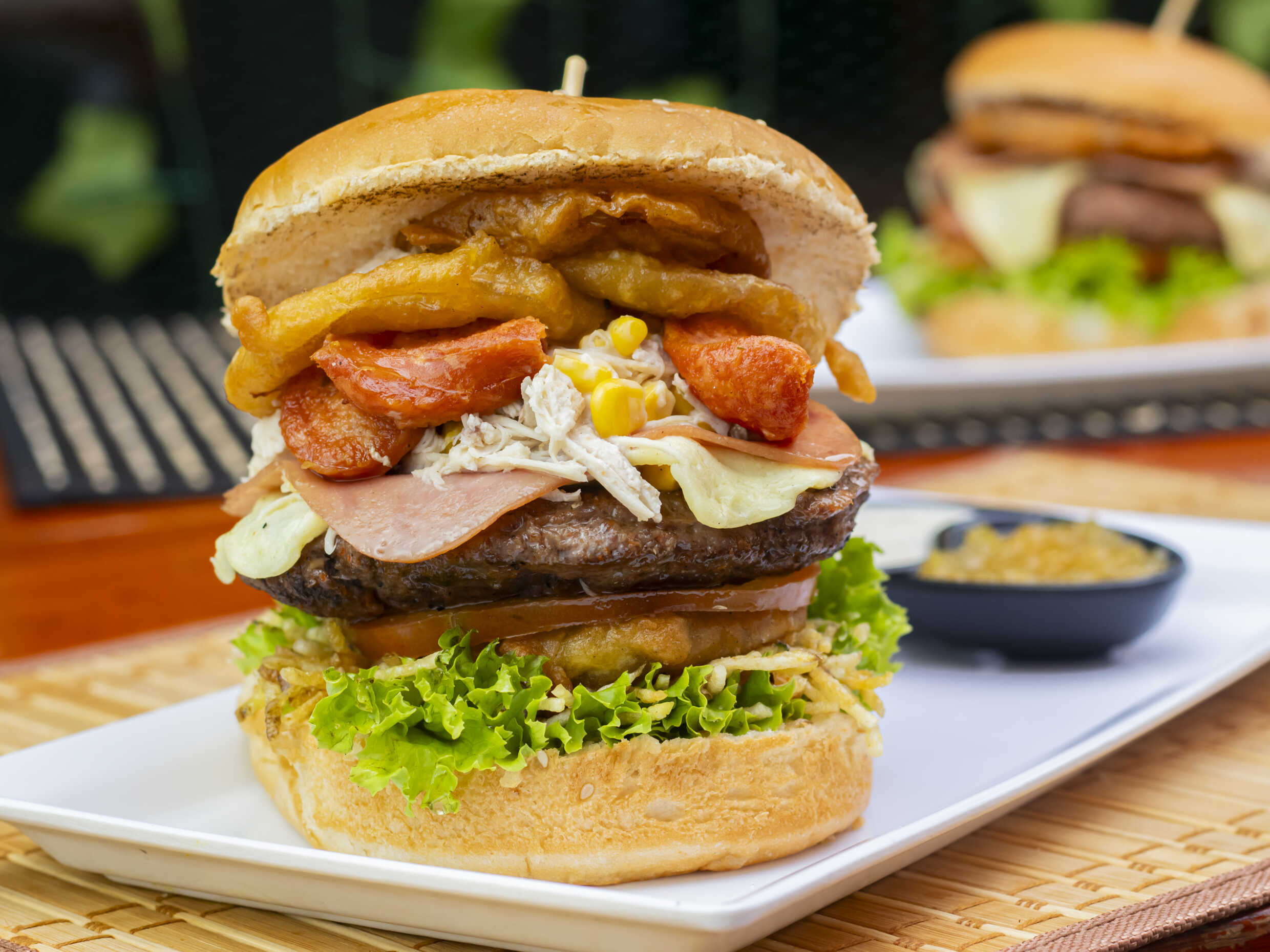 Dos porciones de carne, queso cheddar, pollo desmechado, doble tomate, aros de cebolla, lechuga, jamón, doble porción de queso doble crema, papa chip, cuadros de piña y salsa de la casa, acompañada de papa a la francesa o papa amarilla.