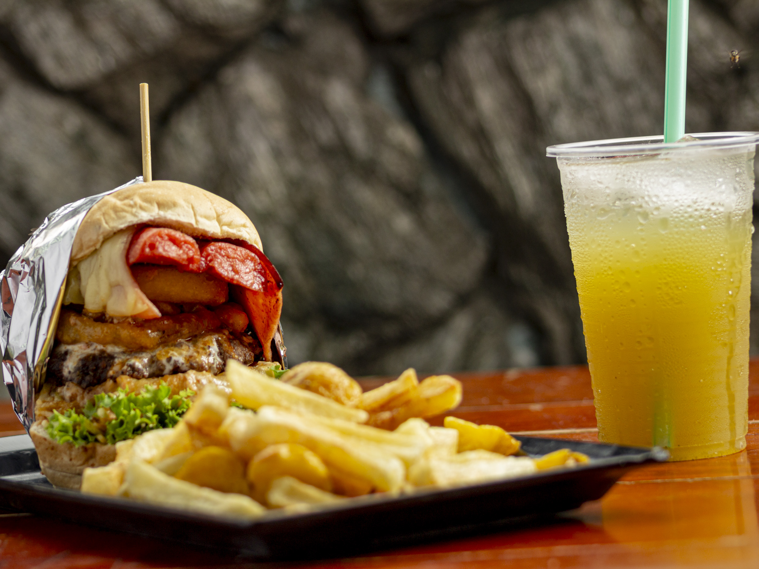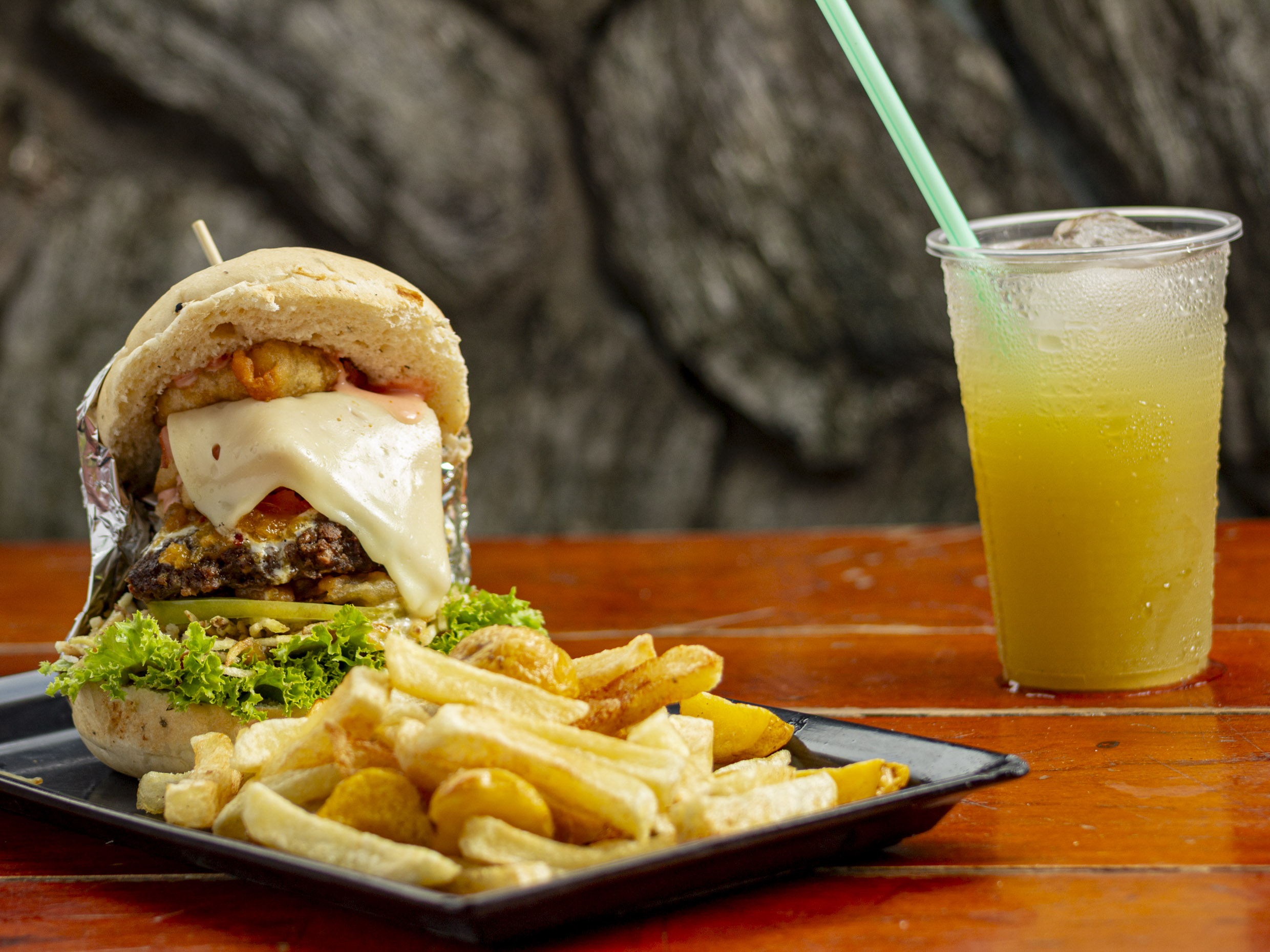Hamburguesa con carne de 90gr, tocineta, crema de queso cheddar, pollo desmechado,aros de cebolla, arepa, papa chip, piña, tomate, lechuga y salsa de la casa. Acompañada de 150 g de papa a la francesa.
